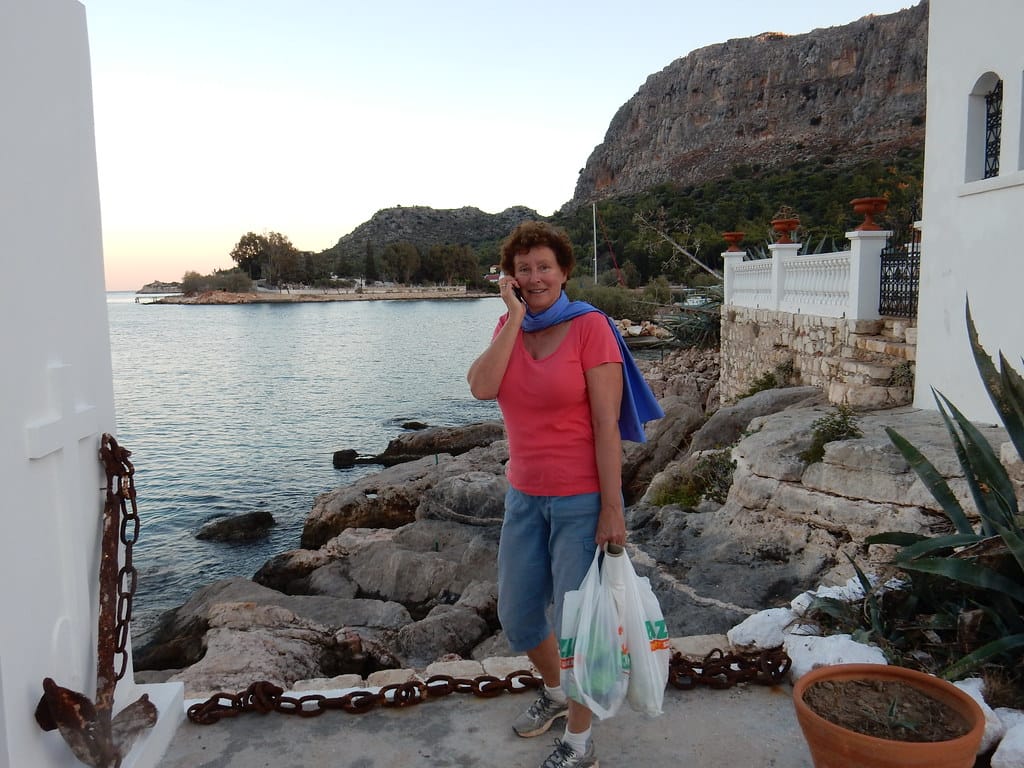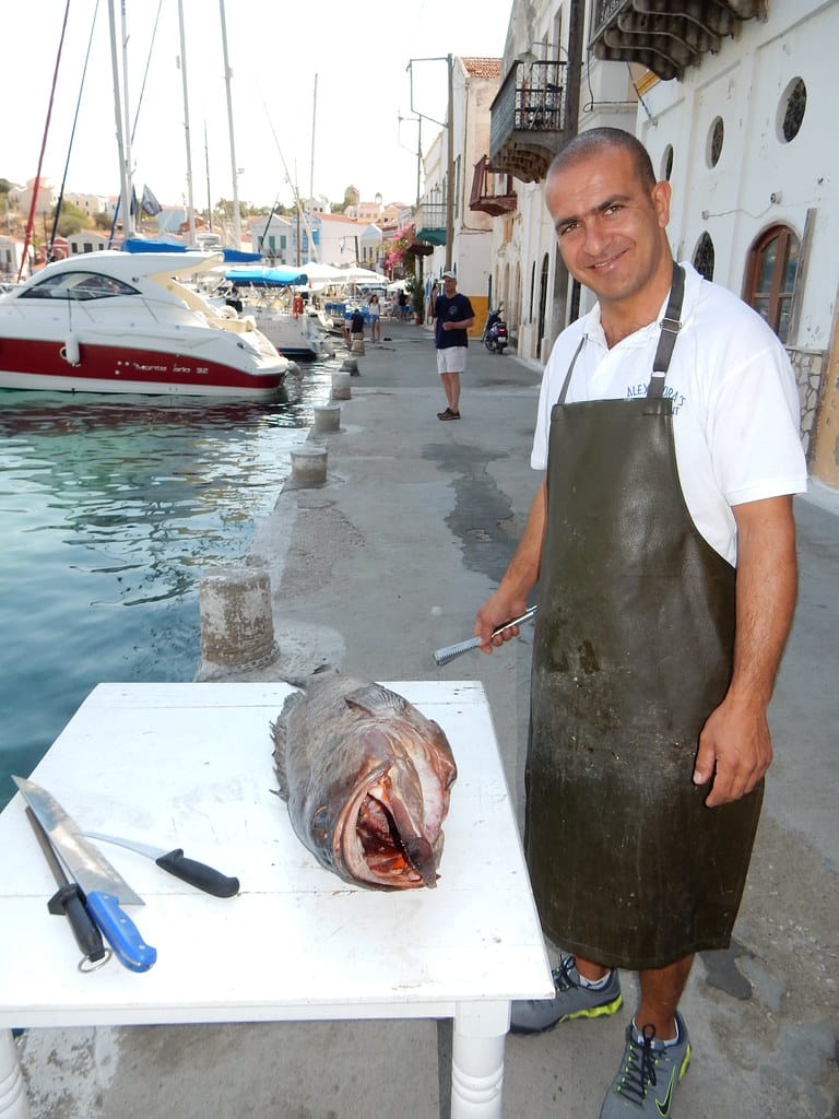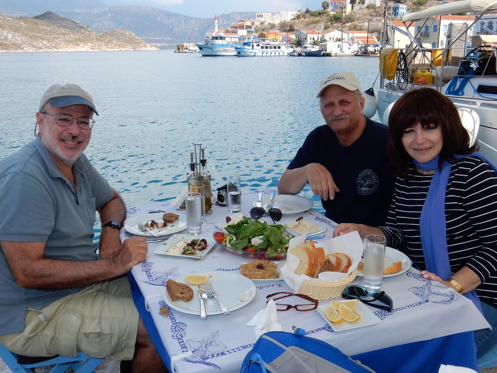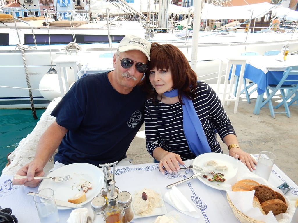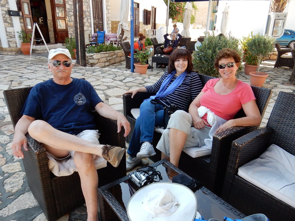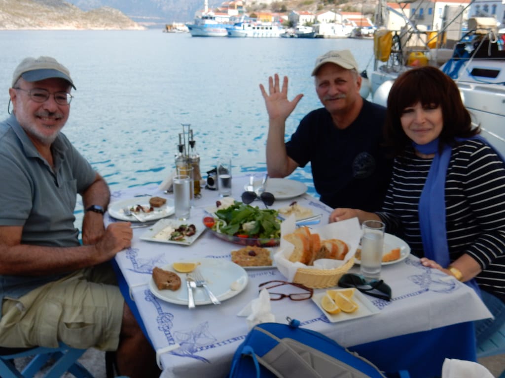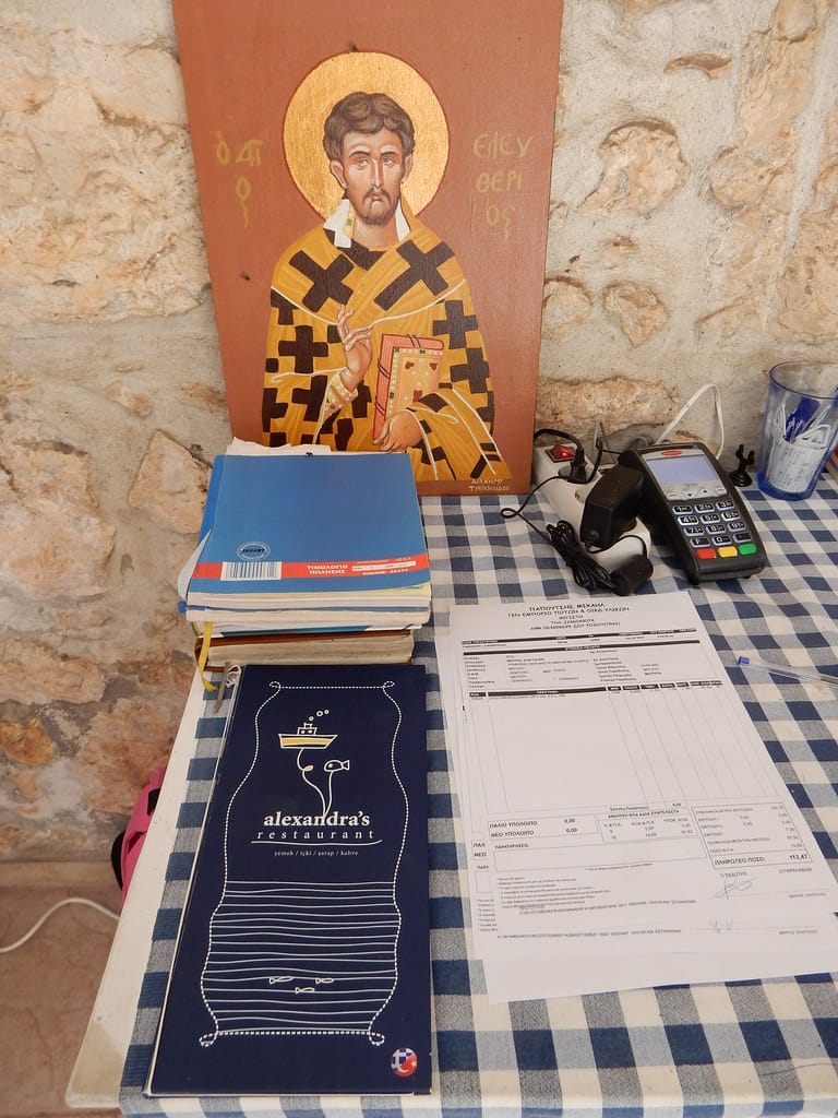 Our favorite spot…. the table over the water at the little restaurant at Aperlai. We always get it… and seem to be the only customers.