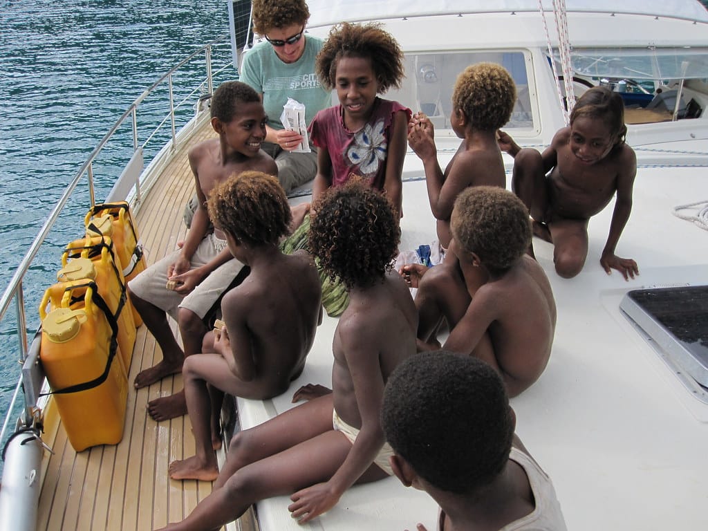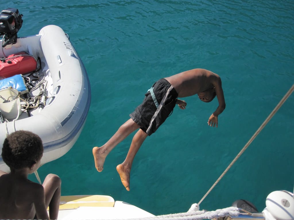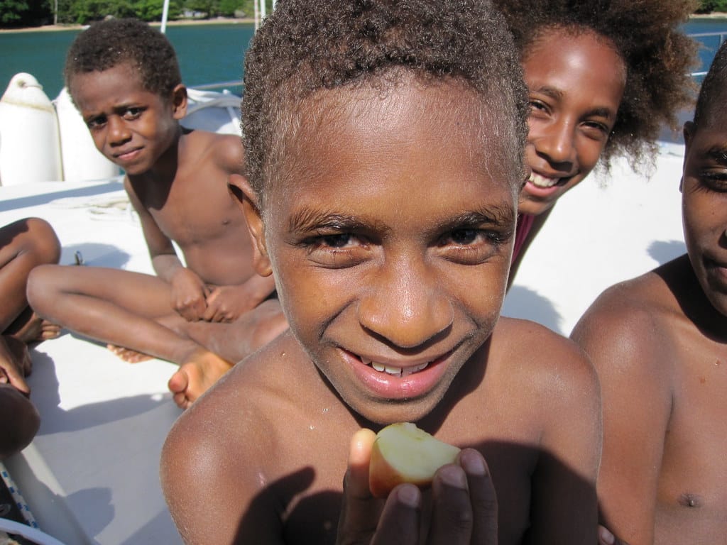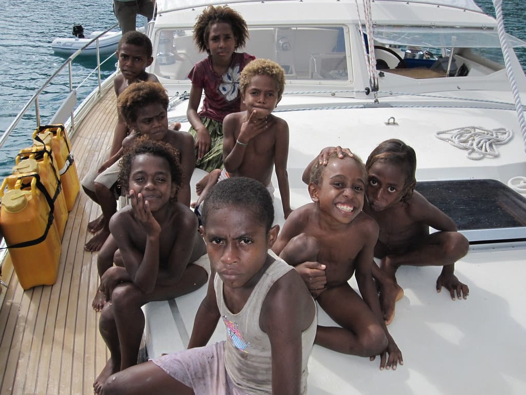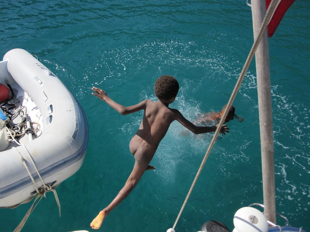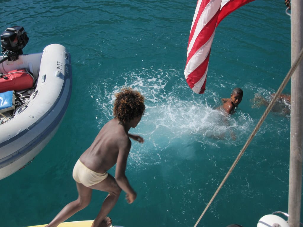 A bunch of local kids swim out to our boat a few days in a row – Loltong, Pentecost