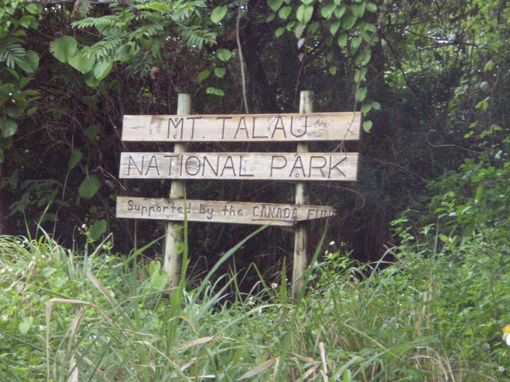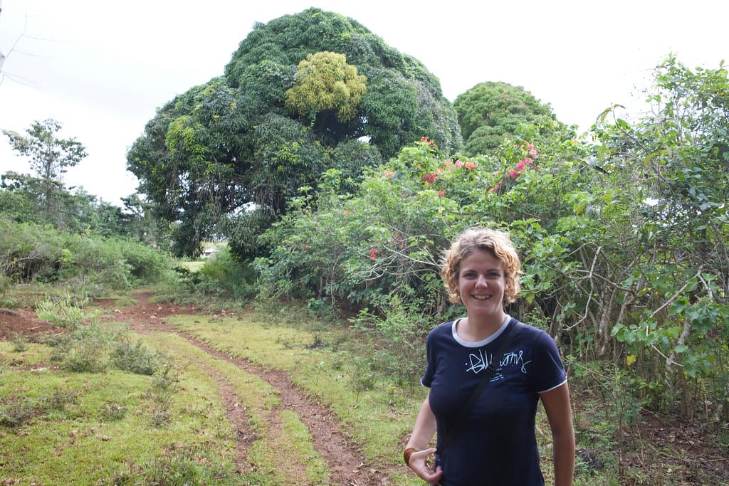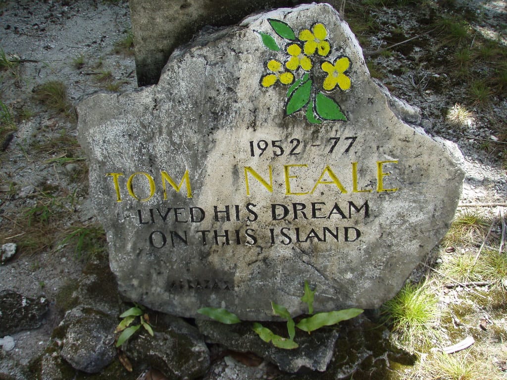 Laura greets the monument to Tom Neale at the entrance to the park