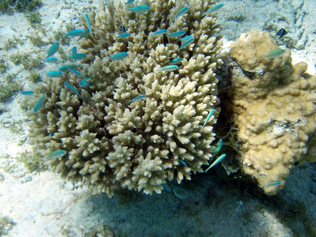 Tiny bluefish hide in the coral and dart in and out