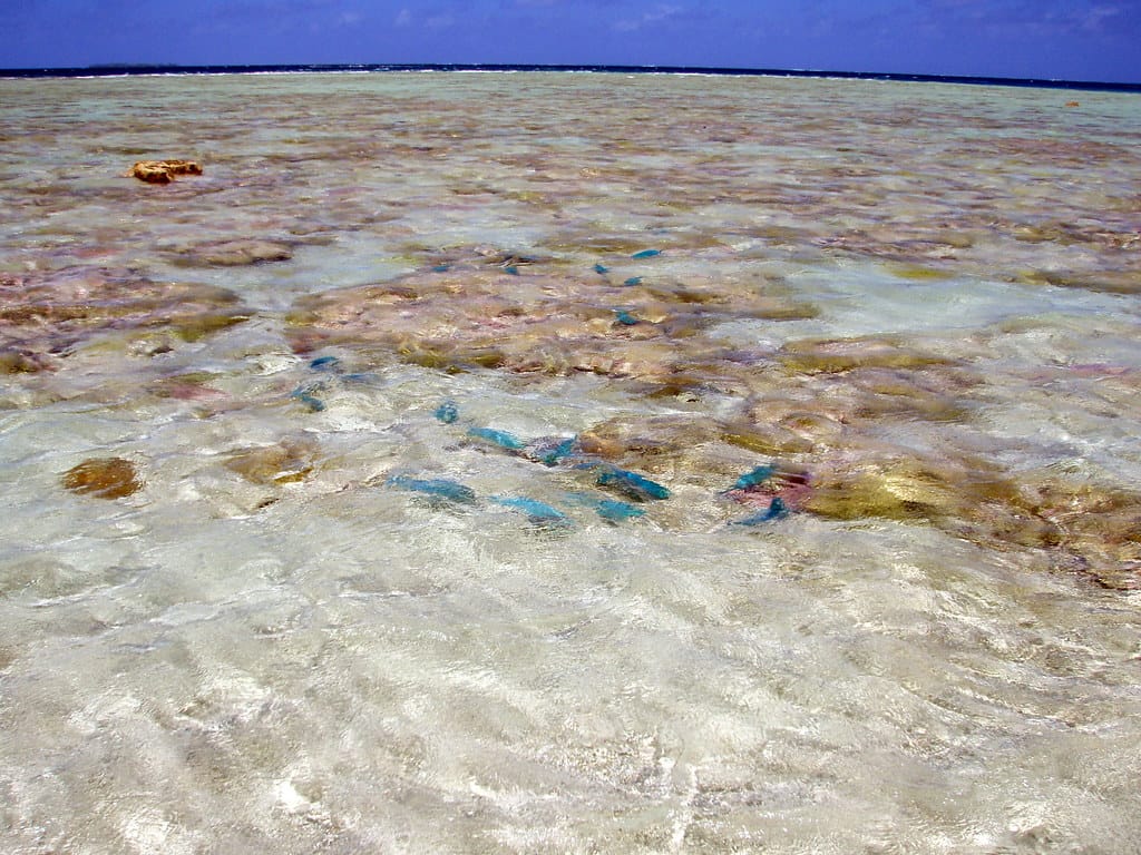 Bright blue parrot fish swim in the shallow water on the off-shore reef of Anchorage Island in Suvarov