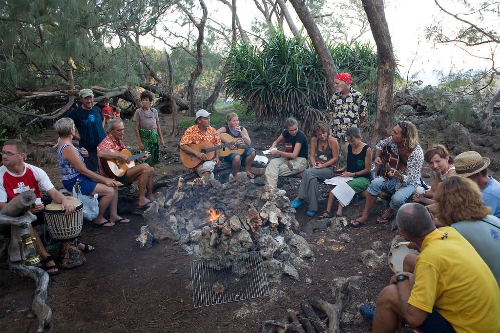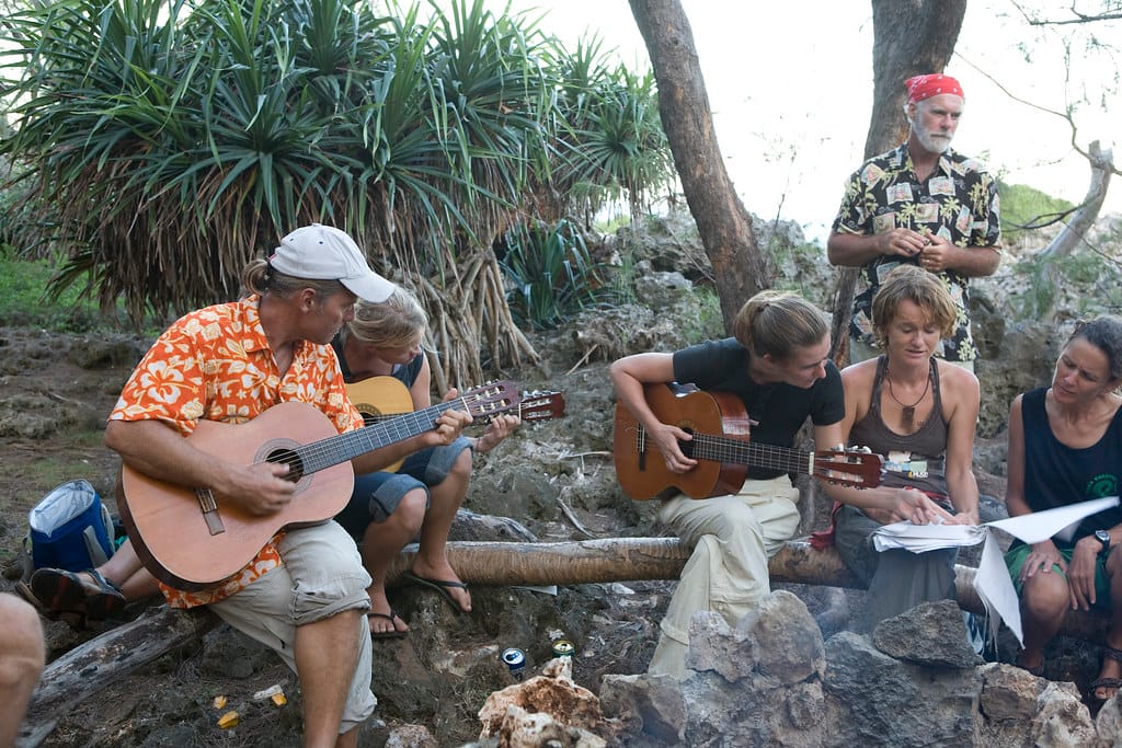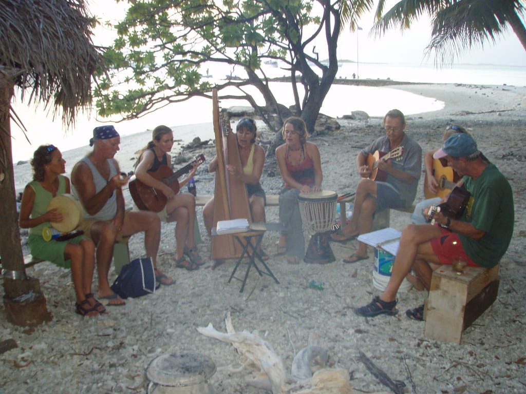 Friends from various boats in the harbor gather for a pot-luck dinner on the beach and music