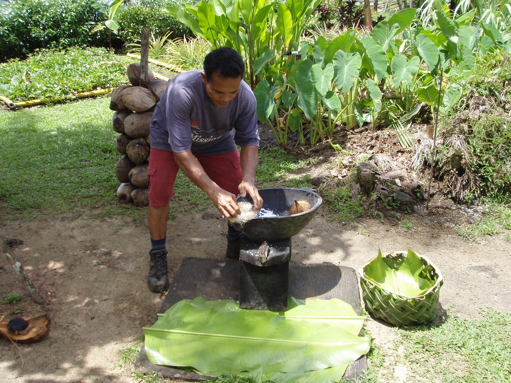 We sit and watch the coconut opening and grinding demonstration.