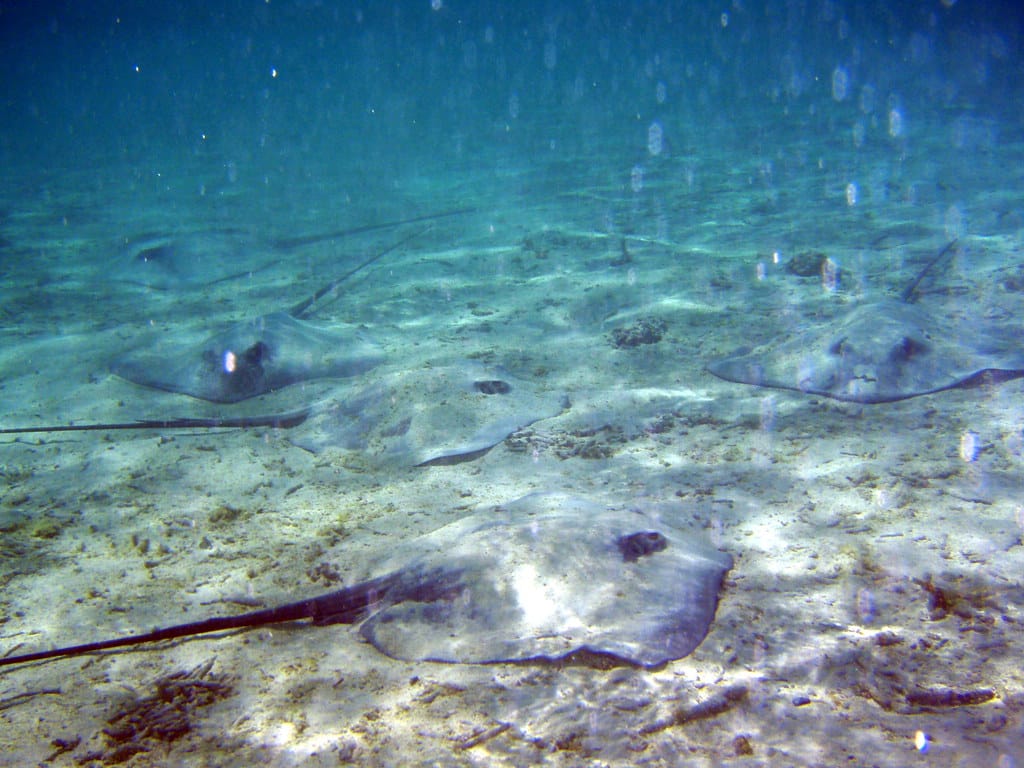The rays are waiting for the tourist boats to stop and feed them. They all swim over and wait when they hear an outboard engine.