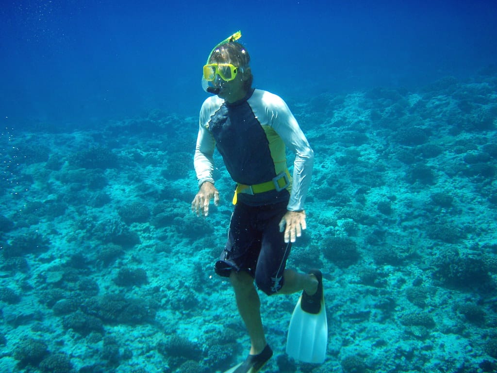 Snorkeling outside the reef we see a large shark 40 to 50 feet under us