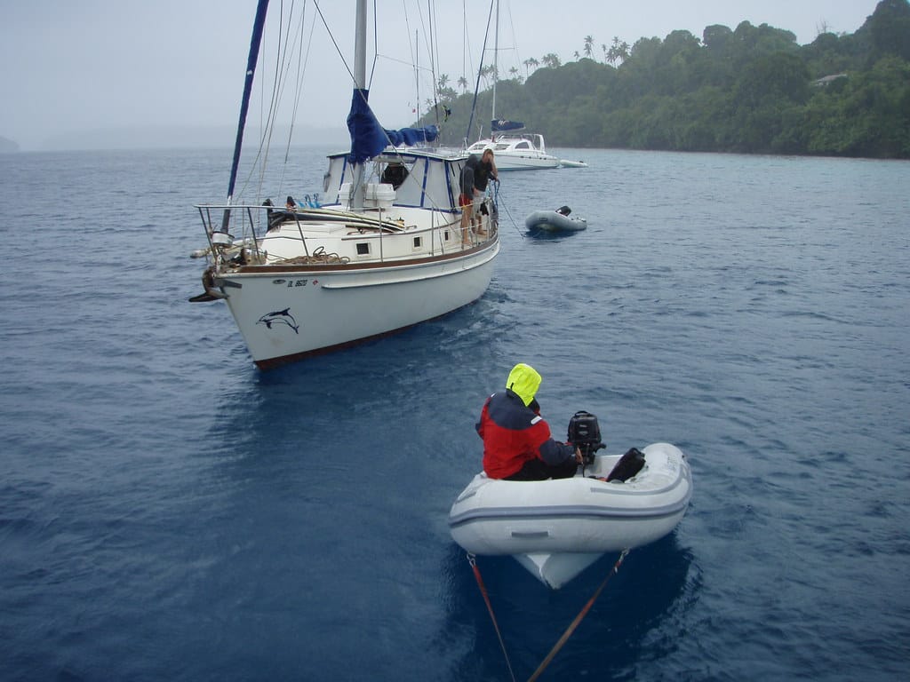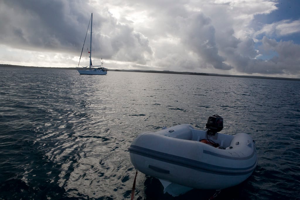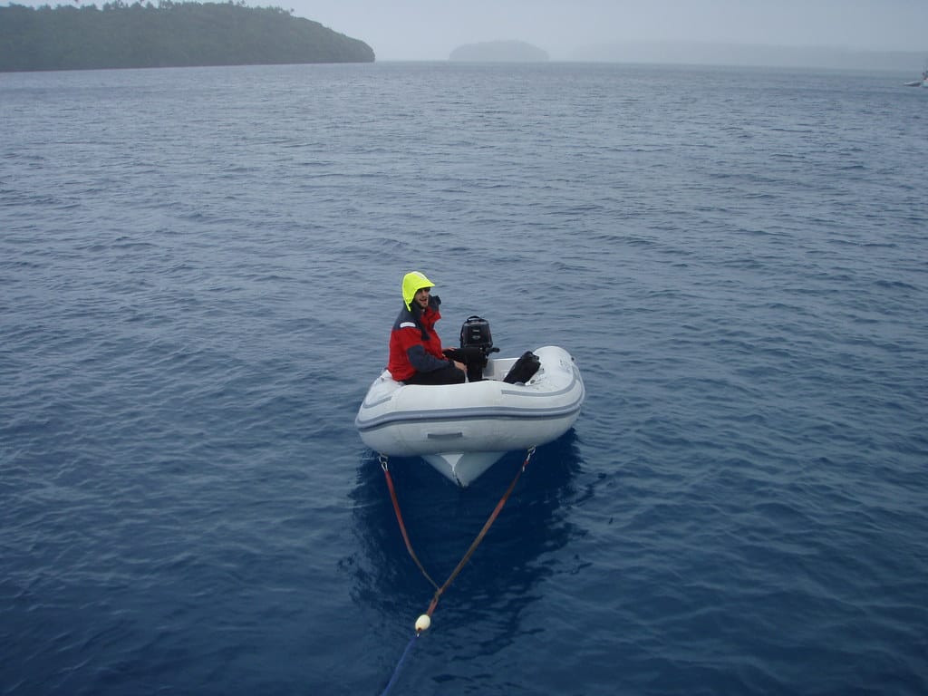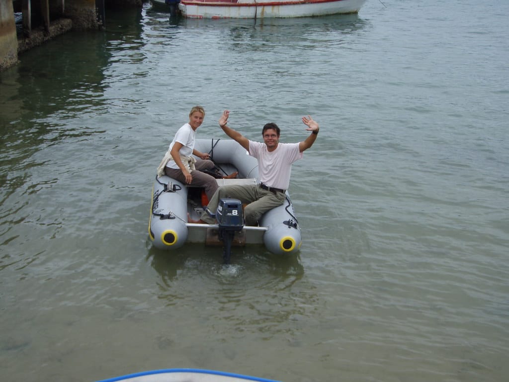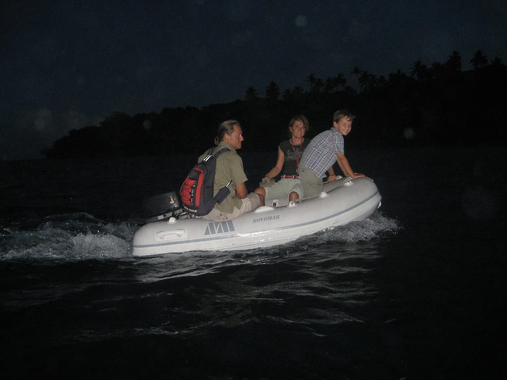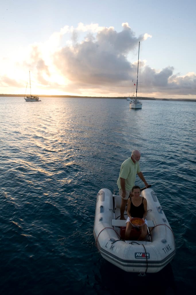 We are both in our dinghies heading towards La Paella for a farewell dinner with Ben