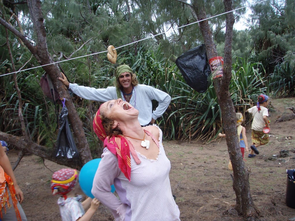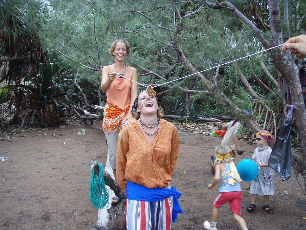 Laura pushes Finn on the palm-tree swing