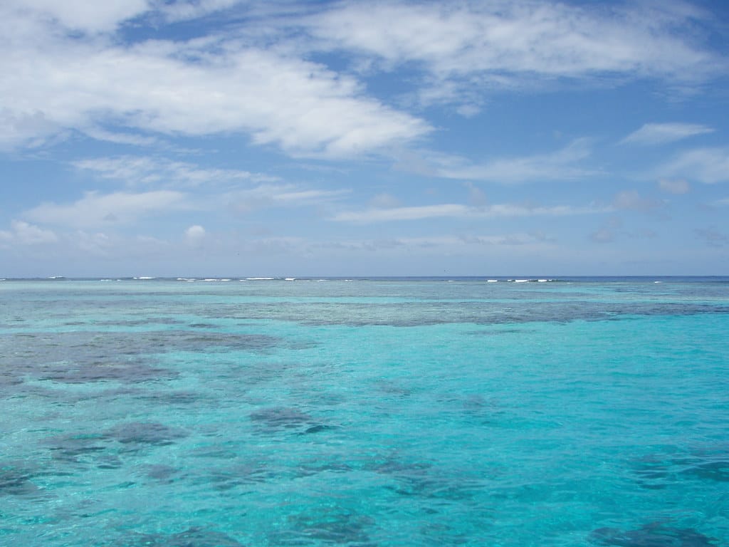 Clear water and blue skies seen from underwater
