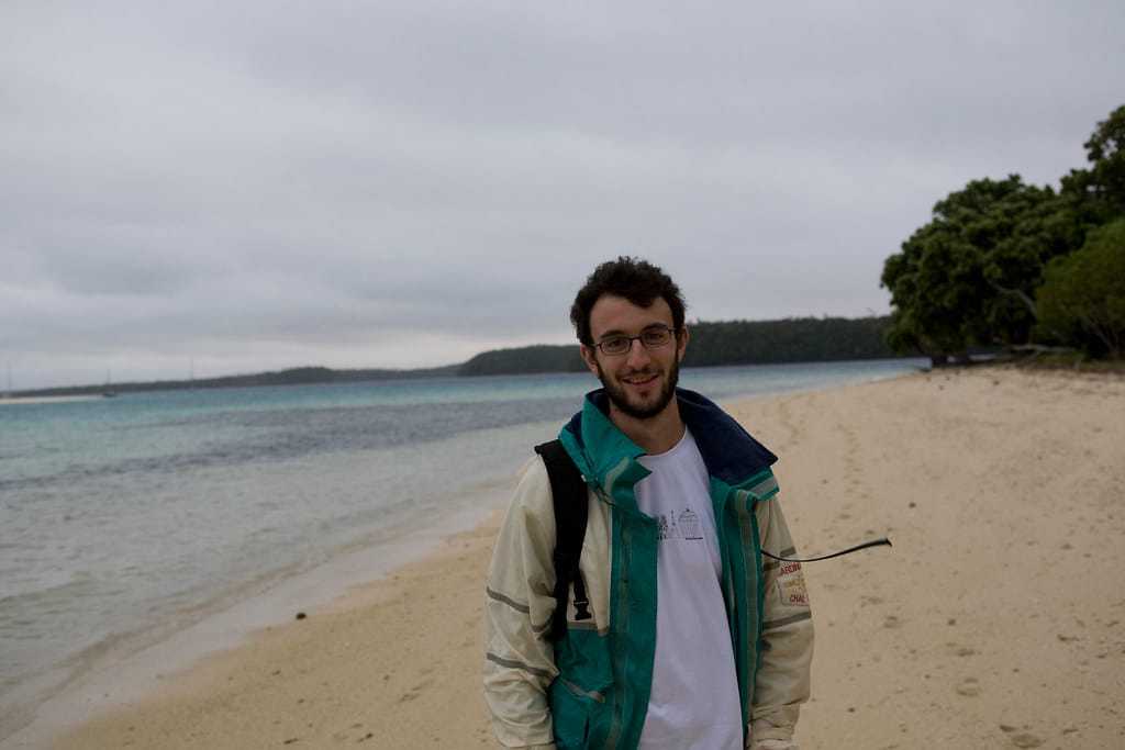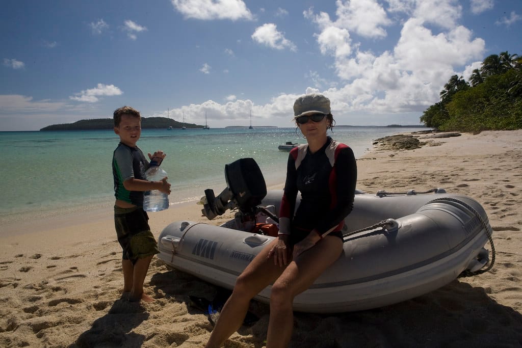 Gesche, Herbert and Yannic come to the small sandy beach on their rowing dinghy