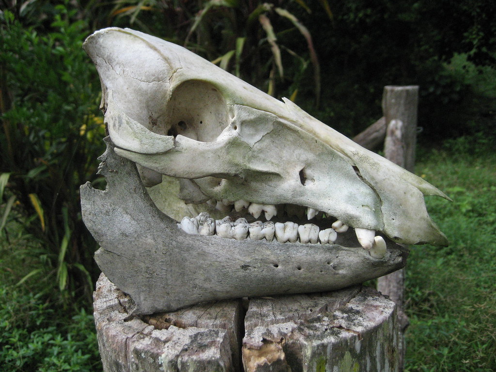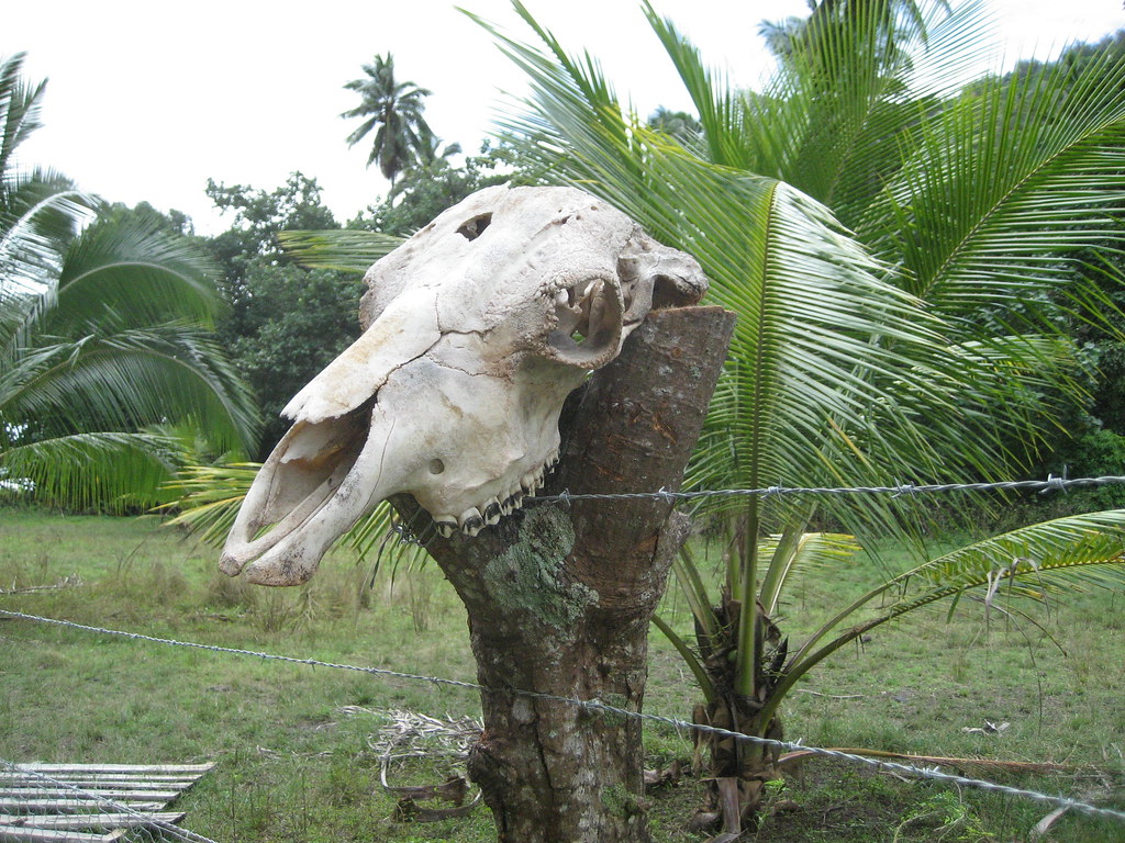 A goat skull decorates a fence