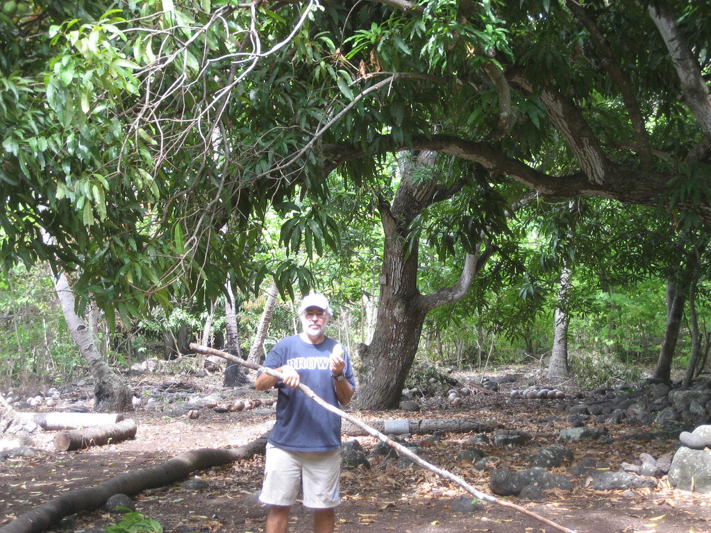 Mark uses a long stick to grab high mangos