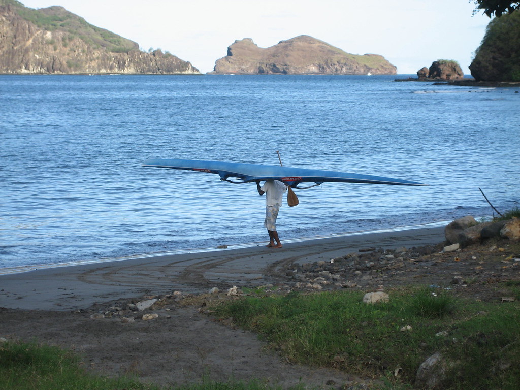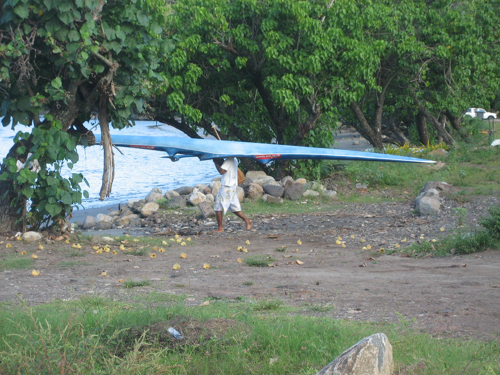 Carrying outrigger out to the bay in Taiohae