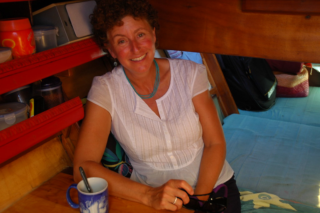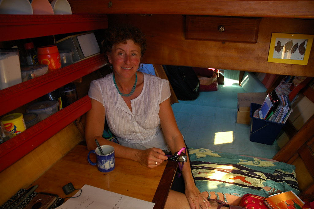 In the port cabin of Risho Maru – where Alex interviews me for a book about sailing wives